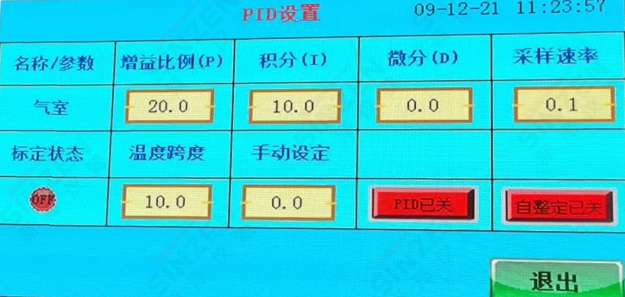 溫度PID自整定畫面應(yīng)該是PID已關(guān)按鍵變成綠色按健,PID已開為正常狀態(tài)。當(dāng)溫度到達(dá)180度設(shè)置值后,需要手動(dòng)點(diǎn)擊一下自整定已關(guān)按鍵,變成綠色,自整定已開,經(jīng)過一分鐘后自動(dòng)恢復(fù)紅色狀態(tài)。